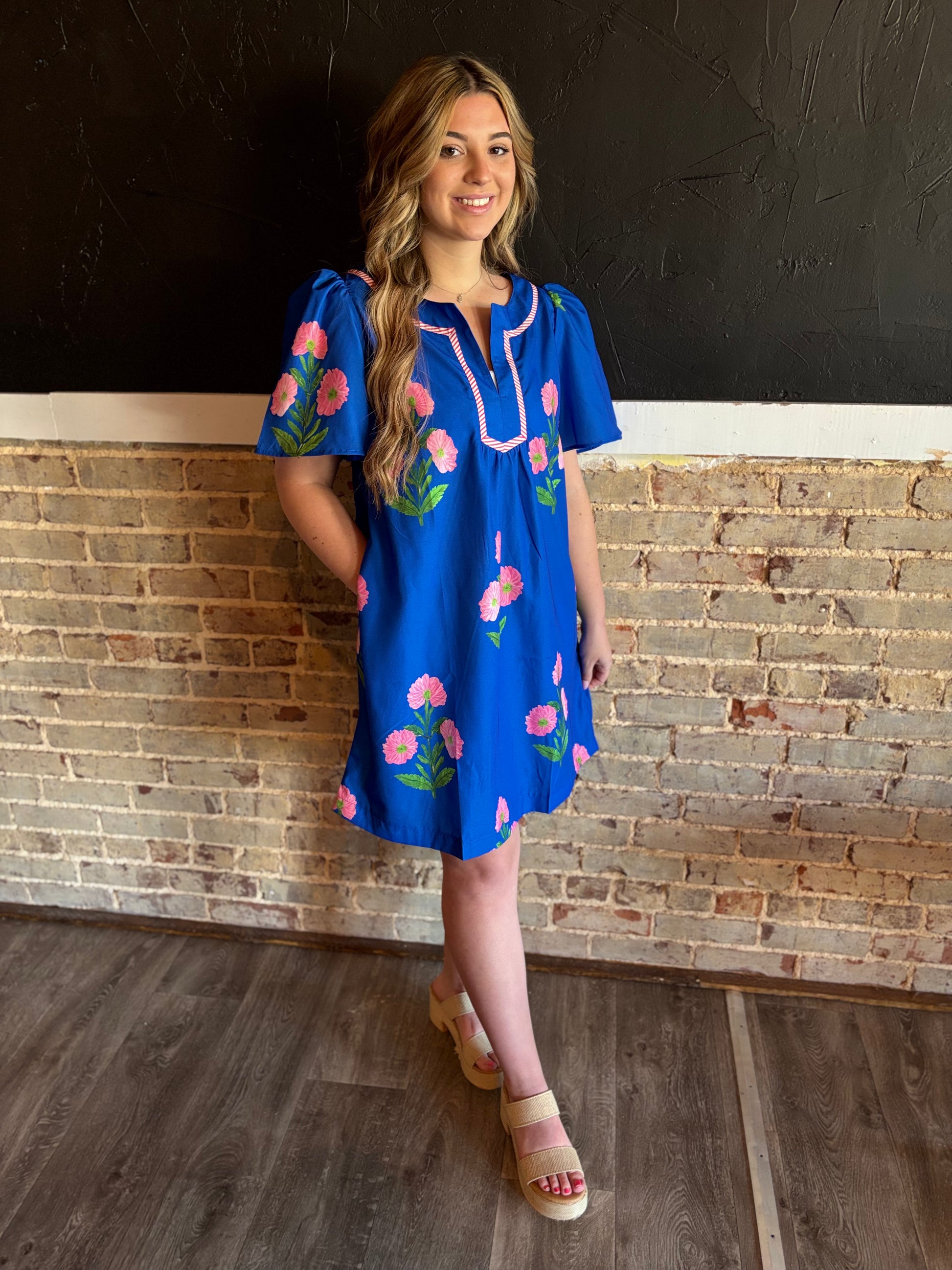 Dark Blue Floral Split Neck Dress